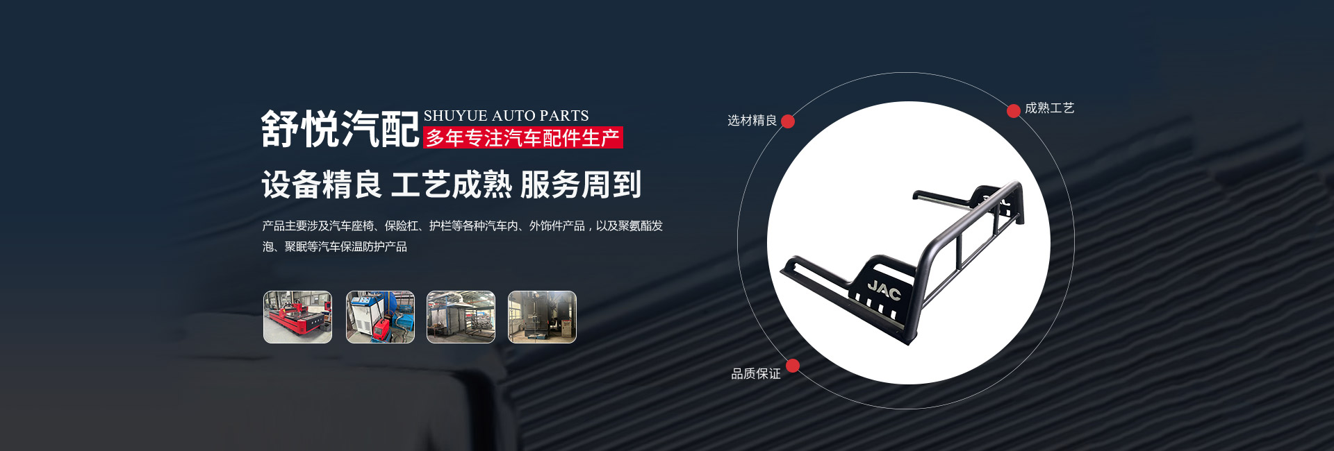 揚(yáng)州舒悅汽配有限公司經(jīng)過多年的穩(wěn)定發(fā)展,業(yè)績一直蒸蒸日上。公司產(chǎn)品主要涉及汽車座椅、保險(xiǎn)杠、護(hù)欄等各種汽車內(nèi)、外飾件產(chǎn)品,以及聚氨酯發(fā)泡、聚脲等汽車保溫防護(hù)產(chǎn)品。其主要是為江淮、金龍,奇瑞等公司服務(wù),已連續(xù)多年成為江淮、金龍等公司的A級(jí)供應(yīng)商。        公司成立于1997年,現(xiàn)坐落于揚(yáng)州市儀征劉集盤古工業(yè)集中區(qū)202號(hào),公司占地面積26640平 方米,廠房建筑面積18512平方米。公司擁有先進(jìn)的制造設(shè)備、可靠的生產(chǎn)工藝、完善的檢測手段和科學(xué)的管理,在售前和售后服務(wù)中做到快速反應(yīng),應(yīng)急應(yīng)變,為客戶提供優(yōu)良產(chǎn)品和滿意服務(wù)。公司的產(chǎn)品開發(fā)能力和生產(chǎn)規(guī)模在同行業(yè)中處于前列的地位。        揚(yáng)州舒悅?cè)吮小罢\信雙嬴”的原則,發(fā)揚(yáng)“誠信、務(wù)實(shí)、創(chuàng)新、貢獻(xiàn)”的企業(yè)精神,恪守“顧客至上”的經(jīng)營宗旨,致精從業(yè),不斷引進(jìn)新技術(shù)、新材料。以優(yōu)良的產(chǎn)品、合理的價(jià)格和周到的服務(wù)參與市場競爭。公司愿與國內(nèi)外朋友建立真誠的合作伙伴關(guān)系,攜手共創(chuàng)輝煌!
